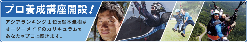 パラグライダー二人乗りができるタンデムフライトの資格取得に向けてオーダーメイドのカリキュラムでサポートします。資格取得後は、仕事の斡旋等、実際にプロとして活躍できるようバックアップします。